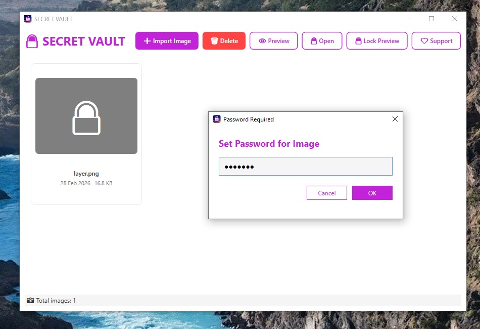Password Encryption Every image you import into the application is encrypted using a password of your choice. Without the correct password, images cannot be opened or viewed. The encryption process uses AES-GCM security standards with PBKDF2 key derivation to ensure strong security.